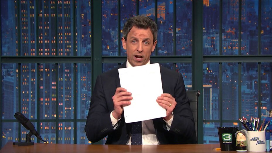 During Late Night’s “Closer Look” segment on Thursday, Seth Meyers broke down the events of the day, even shredding the night’s old script which was written before the news conference, but then Trump held a “batshit crazy press conference that rendered this script completely meaningless,” Meyers explained.